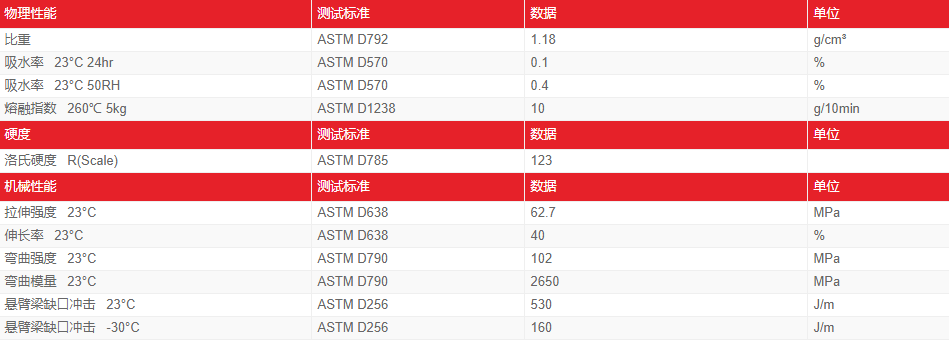 d、耐候性优良,室外曝露2年,拉伸强度和弯曲强度几乎不变,冲击强度为PC的4倍以上。